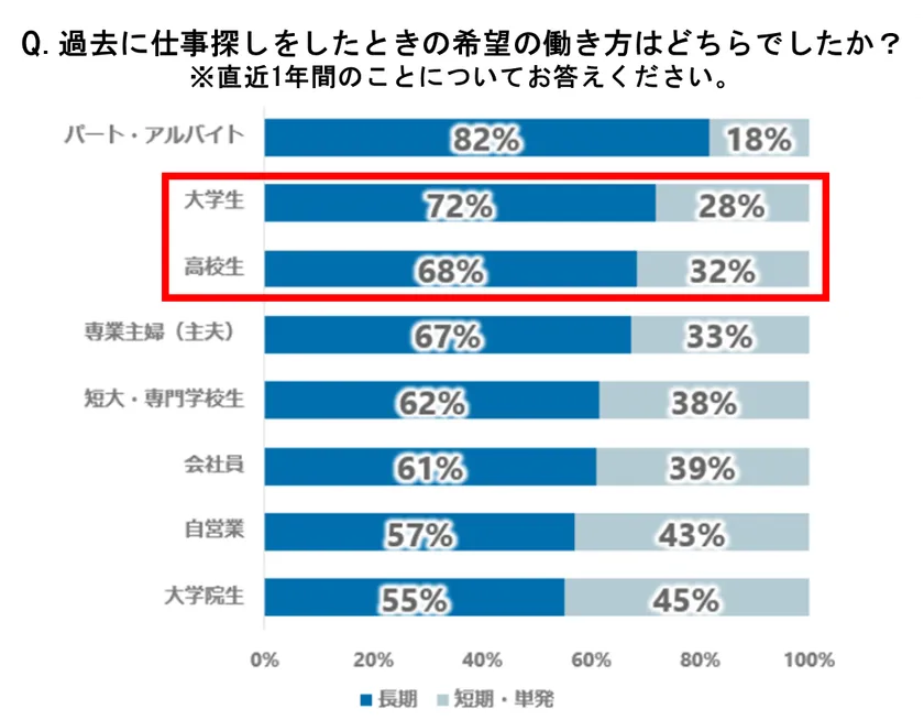 一方で同じ学生層でも、大学院生は「長期(1か月以上)の働き方」を希望する割合が、最も低いです。