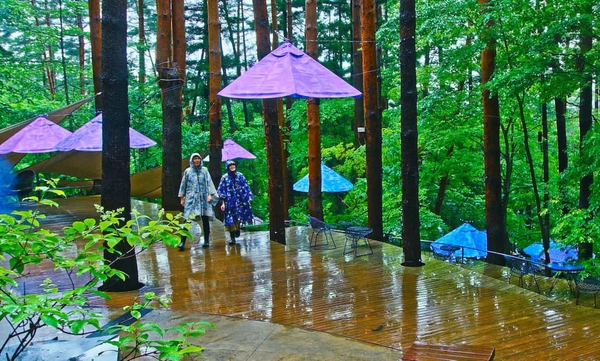 日本初のグランピングリゾート「星のや富士」では、 2021年6月1日~7月15日まで「雨グランピング」を開催します。期間中は客室に備えたポンチョと長靴、雨に濡れると色が変わるオリジナルネックポーチを身につけ、梅雨時期の美しい森を誰でも楽しめます。森の中のクラウドテラスに浮かぶ「雨宿りティピ」を、今年は穏やかな灯りで照らして夜の森を彩ります。梅雨が楽しみになる、新しいスタイルのグランピングです。