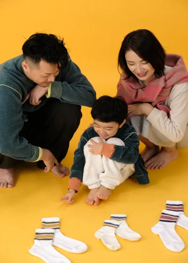 色で家族がハッピーになる親子リンクコーデ。ニットやスウェット、デニム素材にラインの入った靴下がとっても合って、動きやすく、洗濯の扱いもしやすい。スウェット素材は家族で合わせて、ボトムスカラーはママと合わせ、トップスカラーはパパと合わせています。ママとパパは素材以外はカラーリンクがありませんが、お子さんを中心にリンクが成り立ちます。ぜひ家族それぞれが好きなカラーで試してみてください。