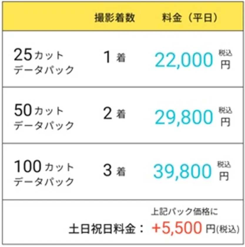 内容:通常撮影プラン(25カットデータ・1着/50カットデータ・2着/100カットデータ・3着)の衣装数を+1着選べる