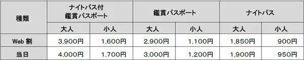【料金】上記、ナイトパスまたはナイトパス付鑑賞パスポートのとおり