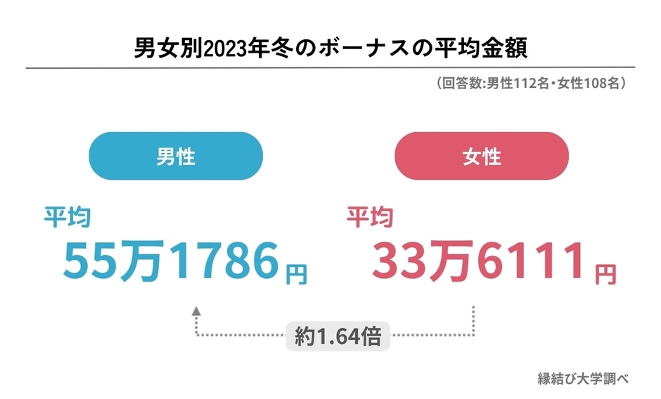 男女別の平均額を見てみると、男性55万1786円、女性33万6111円と、21万5657円の差が出ました。日本は残念ながら、世界の中でも男女格差が大きい国と言われていますが*、今回の調査でもボーナスの金額に男女でかなりの差があることがわかりました。