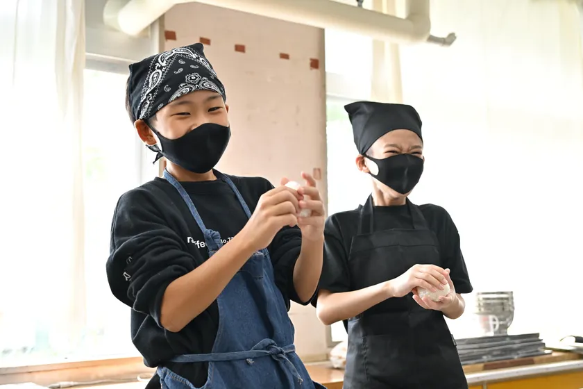 ▲和気藹々とおにぎりを握る児童