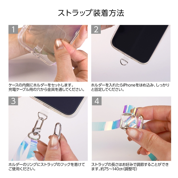 また、付属のストラップホルダーをケース内に入れることでロングストラップを使用することができ、斜め掛けや肩掛けにして持つことが可能です。