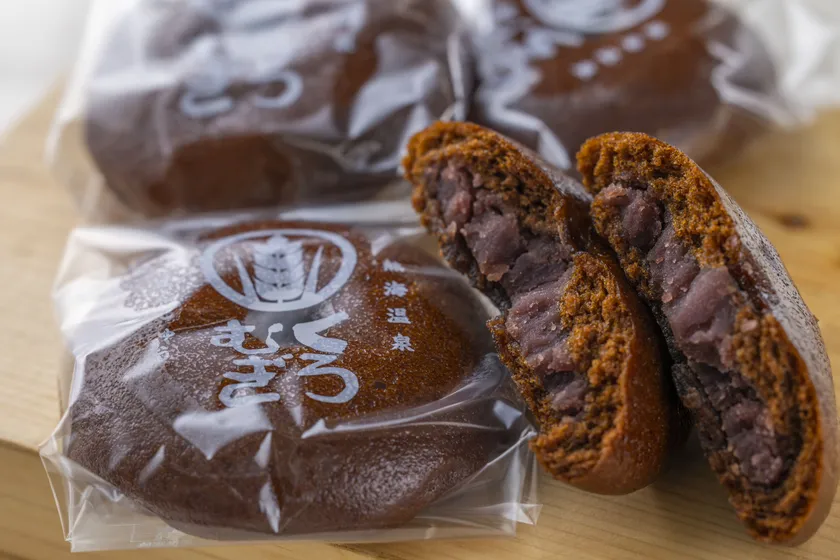 たっぷりの特製黒蜜を使用した生地に熱海の縁起物である「麦こがし」を練りこみ、低温でじっくり蒸しあげました。しっとりモチモチとした食感と麦こがしの香ばしさが美味しい、熱海生まれの温泉まんじゅうです。樹齢2,000年を超える大楠があり日本屈指のパワースポットとされる熱海・來宮神社への奉納菓子です。