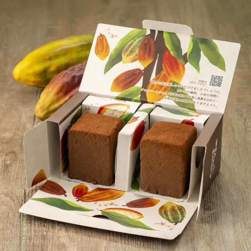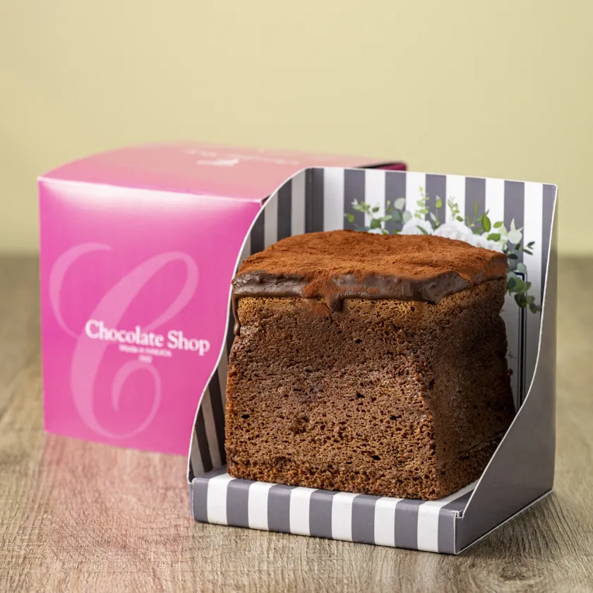 チョコスポンジ・生クリーム・バニラスポンジ・チョコムースの5層になったチョコレートショップ1番人気のケーキです。2個入のパッケージをリニューアルし、箱を開けた瞬間から楽しめる1品となりました。