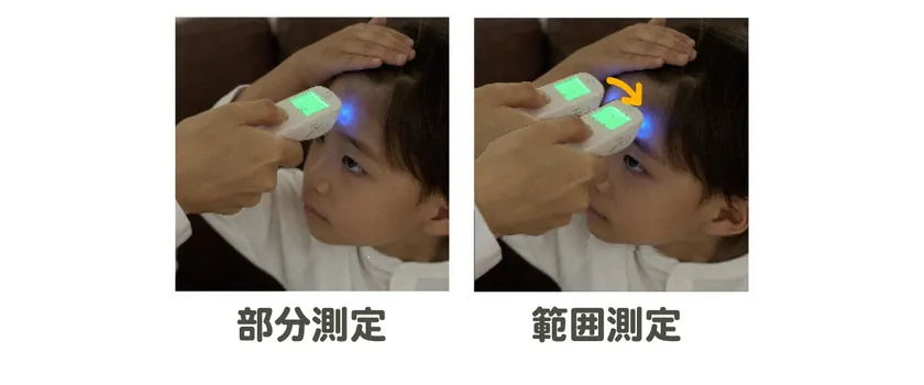 額の一か所を測定する「部分測定」は約2秒、額の範囲内をゆっくりスライドさせて測定する「範囲測定」は約3秒で検温可能。