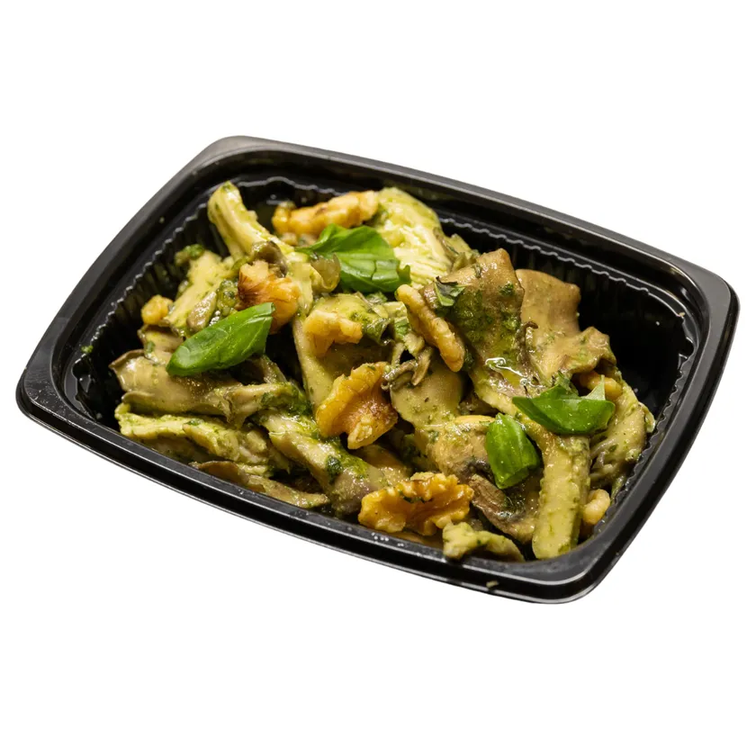 しっとりジューシーに茹であげたむね肉と香り高く焼き上げた3種のきのこを、くるみを使った濃厚なジェノベーゼソースで合わせました。