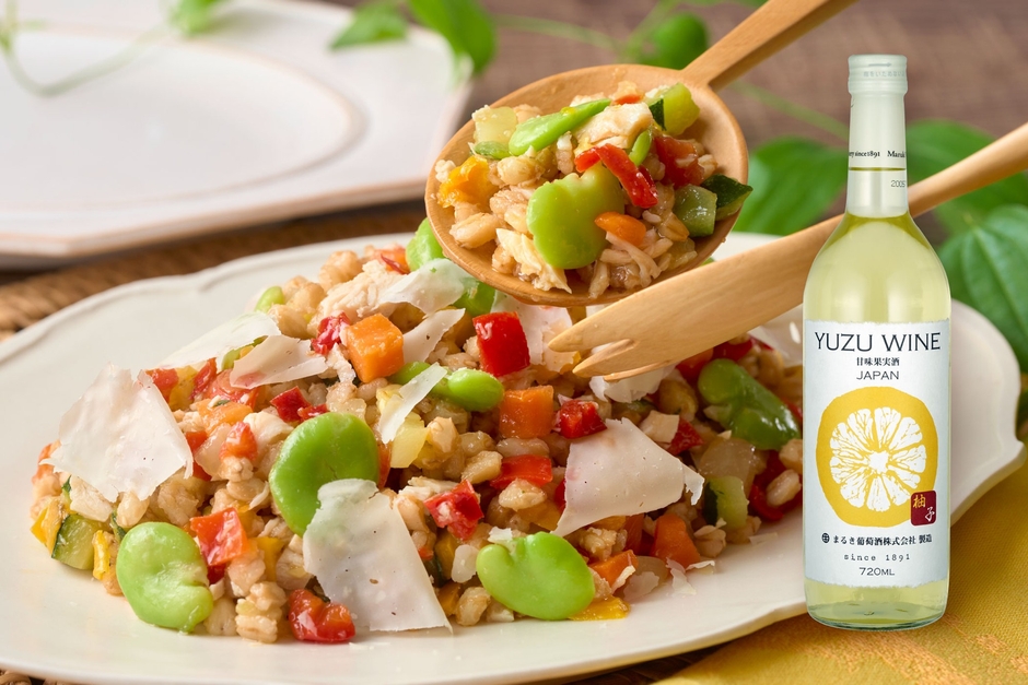 左)ゆず本来の味わいが楽しめる「ゆずワイン」とカラフルな見た目と食感が楽しい「ツナと小麦の菜園風サラダ」の組み合わせは、食事のスタートにおすすめです。