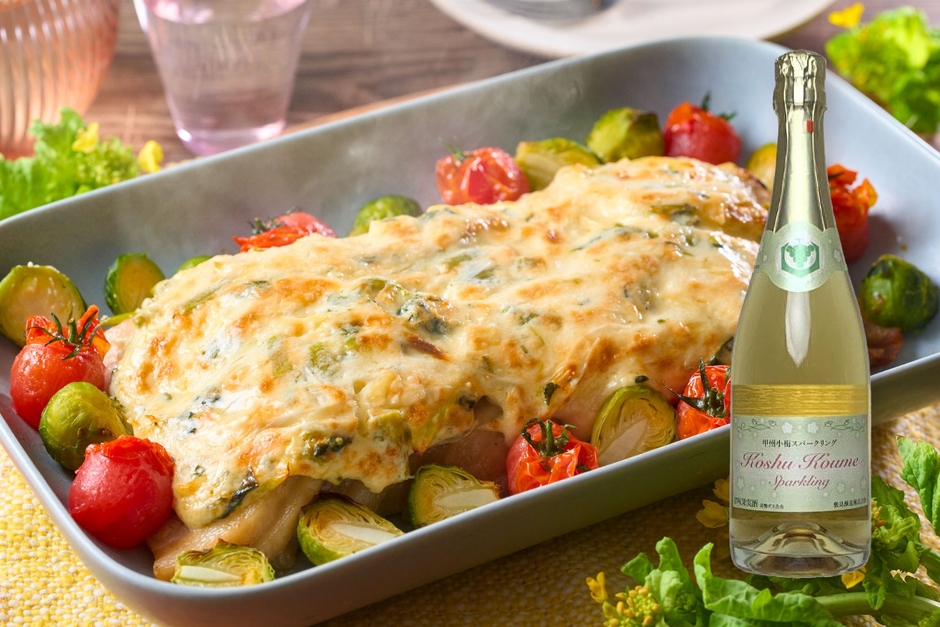 右)さわやかな酸味とフルーティーな香り、クリーミーな泡立ちが特徴の「甲州小梅スパークリング」は濃い目の味付けのお料理に合うので「富士桜ポークの菜種焼き」などのお肉料理との相性も抜群です。