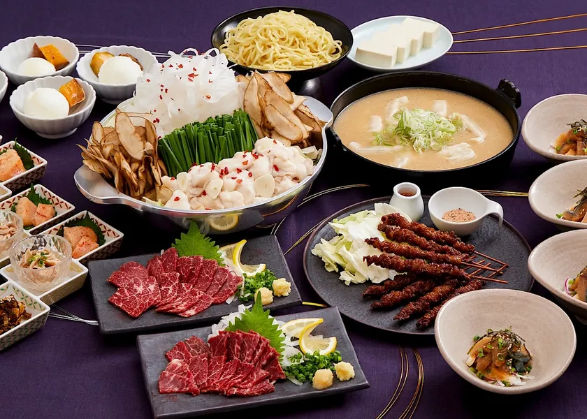 また、「宴~うたげ~」コースは、九州の豊かな食材をふんだんに使用した全8品のコースメニューで、年末年始の宴会シーズンにふさわしい贅沢な内容となっています。博多名物のもつ鍋(醤油味or味噌味or極旨もつ鍋)をはじめ、霜降り馬刺しや炊き餃子、ごまさばの他、長崎県五島産のブランドさつまいも“五島ごと芋”に伊都みるくアイスを添えたスペシャルデザートまで、九州ならではの多彩な味覚を存分に堪能していただけます。