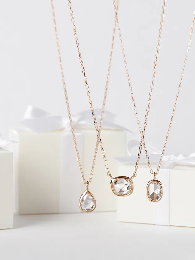 「ペアシェイプ(雫型)」「オーバル(楕円型)」「マーキス(小船型)」「トライアングル(三角形型)」「ラウンド(丸型)」の5種類のシェイプから選び、お好みでネックレスまたはリングを選択可能です。ダイヤモンドの向き(縦向き・横向き)もお選びいただけます。