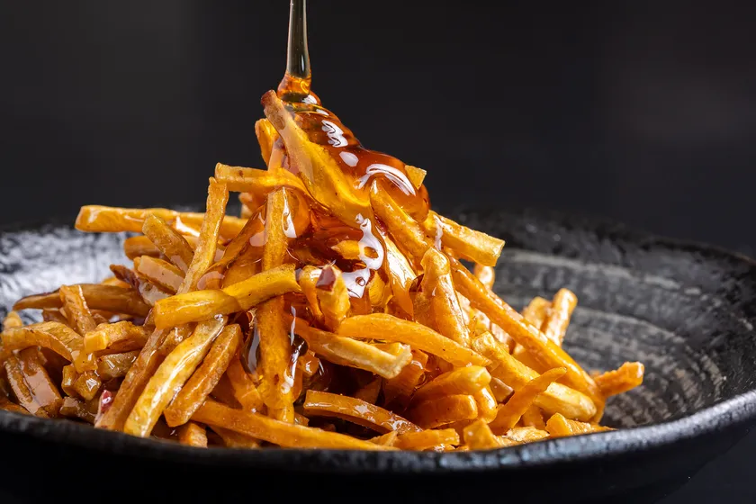 蜜かけバージョンも新発売!おいも日和特製の蜜を揚げたて芋ケンピに絡ませ更にご提供時にたっぷり「追い蜜」します。