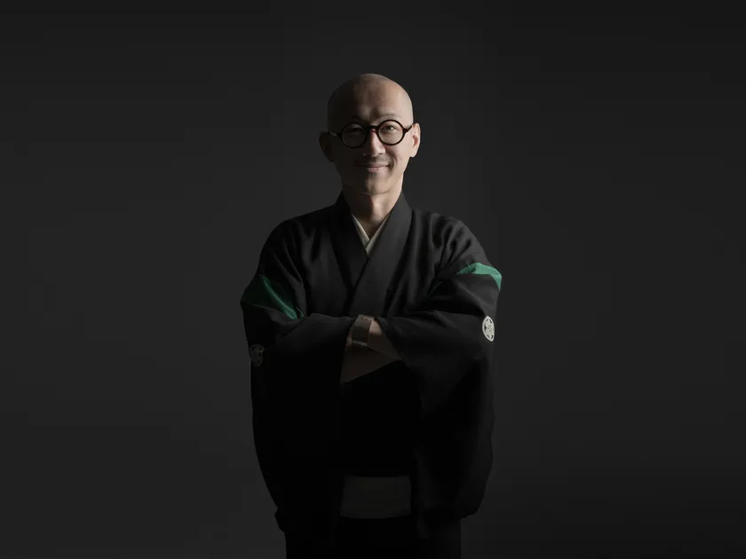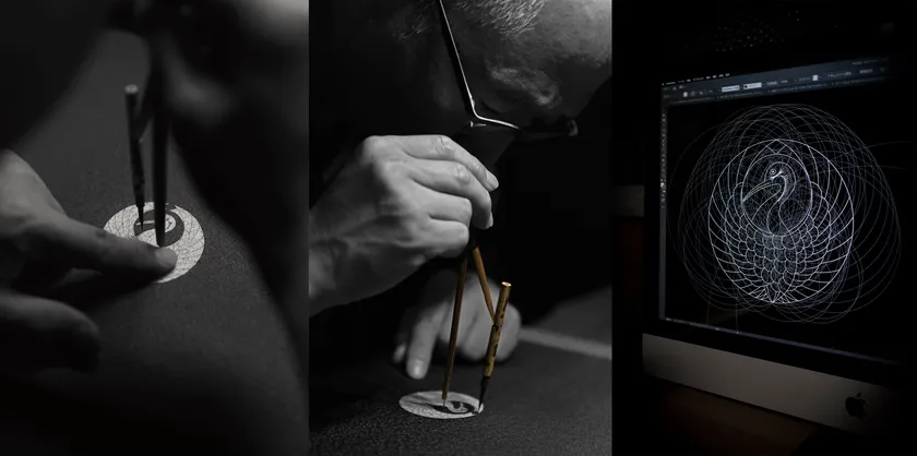 京源は1910年、家紋を着物に描く前の工程を担う職人「紋糊屋(もんのりや)」として、初代 波戸場源次によって京橋で創業されました。二代目は着物に家紋を手で描く「紋章上繪師(もんしょううわえし)」となり、三代目 波戸場承龍、息子の耀鳳へと引き継がれています。承龍・耀鳳親子は2010年に工房「誂処 京源」を立ち上げ、昔ながらの手描きの手法にデジタル技術を導入し、伝統的な意匠と現代感覚を融合した、家紋による新たな表現を指向しています。