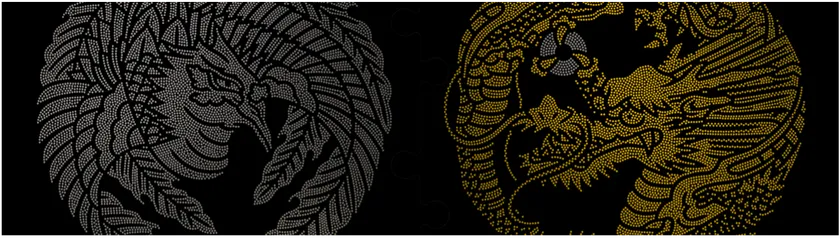 波戸場承龍・耀鳳親子を表す「龍」と「鳳凰」の家紋を太鼓の鋲で表現した大型アート作品