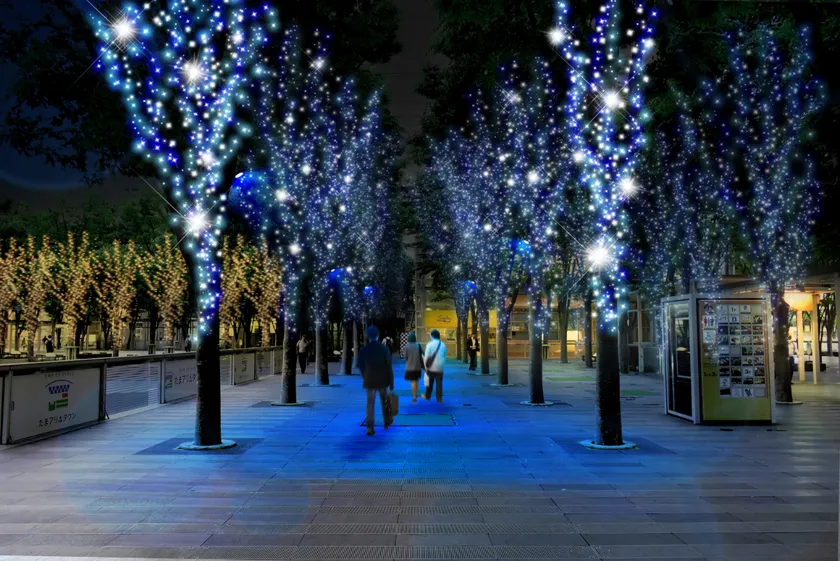 今年度は、「Blessing Forest ~祝福の音と光のシンフォニー~」と題して、音の演出と光の動きに工夫を凝らしたイルミネーションをお届けします。さいたま新都心駅を降りて左に進み、入口のウェルカムゲートをくぐると、ブルー系を中心としたLED約20万球によりライトアップされた約150本のけやきが皆さまを幻想的な世界へいざないます。