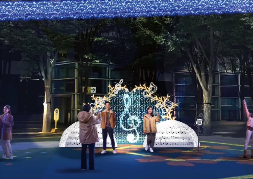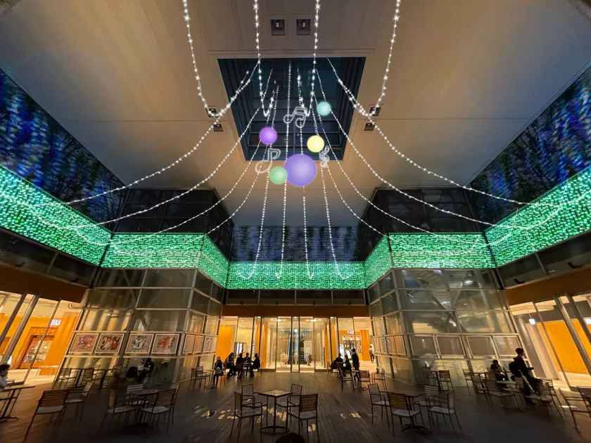 並木道を通ると芝生広場に到着します。昼間はお子様が楽しく遊べるアート床となっている芝生広場頭上には、光る五線譜が登場します。そして、芝生広場内のフォトスポットでは、二次元コードを読み込むと音楽を再生することができます。(再生式:MP4)画像や動画と共にご自宅でも、余韻をお楽しみいただけます。