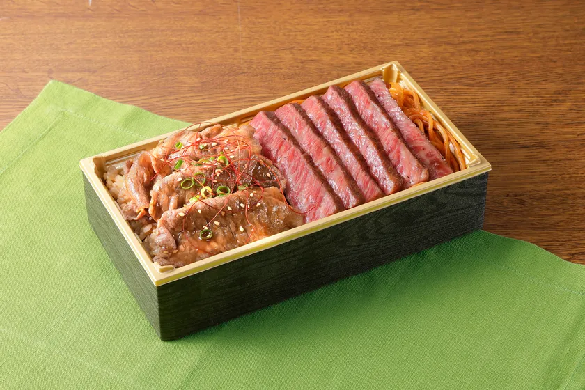 長崎市内で生産されている長崎和牛『出島ばらいろ』は、赤肉と霜降りのバランスを追求した肉質が特徴。出島ばらいろのロースステーキの下にはナポリタンを、焼肉の下にはガーリックライスを入れた贅沢なトルコライス弁当。