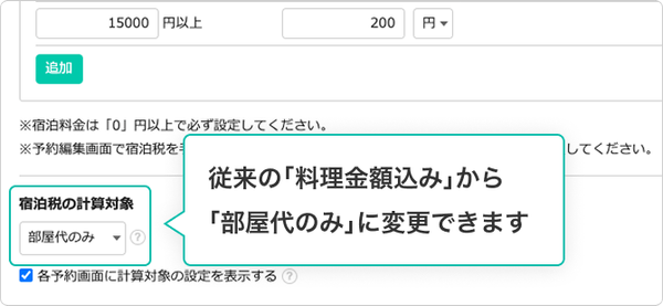 「部屋代のみ」を宿泊税の計算対象に設定できるようになりました。