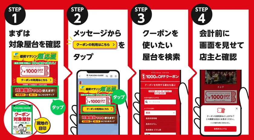 クーポンは長浜・天神・中洲エリアの計62屋台で利用でき、会計時に屋台のスタッフへクーポンを見せることで飲食代より1,000円が値引きされます。