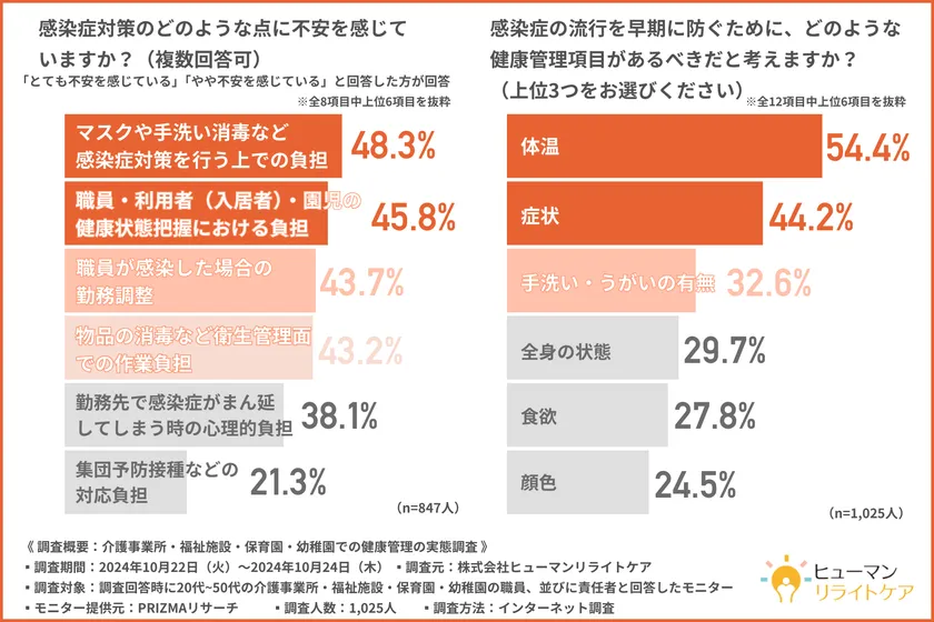 そこで今回、株式会社ヒューマンリライトケア( https://www.humanrelightcare.com/ )は、20代~50代の介護事業所・福祉施設・保育園・幼稚園の職員、並びに責任者を対象に、介護事業所・福祉施設・保育園・幼稚園での健康管理の実態調査を実施しました。