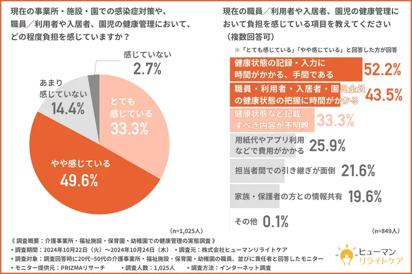 「現在の事業所・施設・園での感染症対策や、職員/利用者や入居者、園児の健康管理において、どの程度負担を感じていますか?」と質問したところ、約8割の方が『とても感じている(33.3%)』『やや感じている(49.6%)』と回答しました。