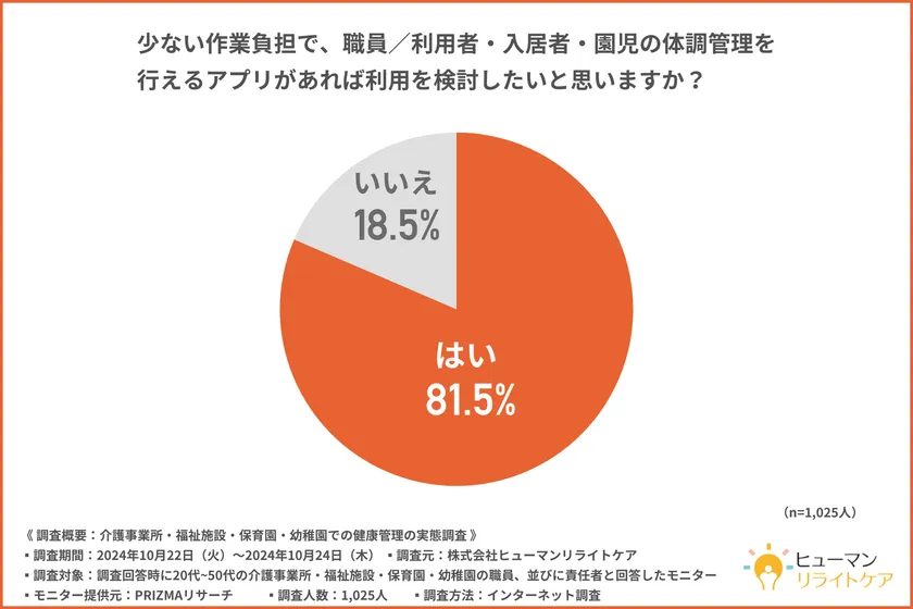 そこで、「少ない作業負担で、職員/利用者・入居者・園児の体調管理を行えるアプリがあれば利用を検討したいと思いますか?」と質問したところ、約8割の方が『はい(81.5%)』と回答しました。