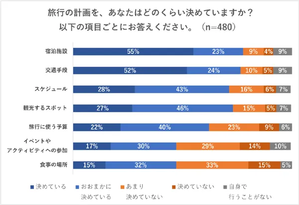 宿泊施設や交通手段などの項目別で、計画をどのくらい決めているかに関する質問をしたところ、項目によって大きく割合が変わることがわかりました。