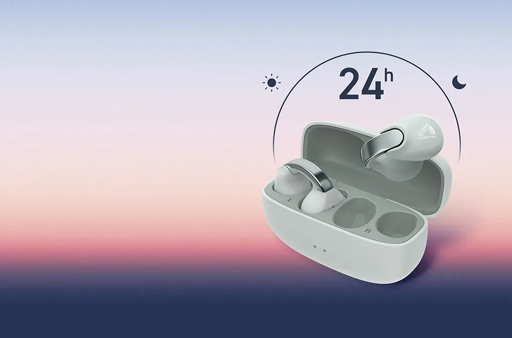 耳をふさがない開放型で、イヤリングのようなファッション性や、つけていることを感じさせないフィット感により、自然で心地よい新感覚リスニングが楽しめます。また、着脱しやすく長時間つけていても耳が痛くなりにくい独自の柔軟な可動機構「フレキシブルアジャスト」で快適なつけ心地です。耳をふさがないため耳の負担や周囲の音が聞こえない不安感を軽減し、仕事や家事・育児、ジムでの運動やヨガ、ジョギング時など様々なシーンで周囲の音を感じながら「ながら聴き」を楽しむことができます。さらに、充電ケースは女性の手のひらにもスッポリ収まるスリムなコンパクトサイズで、小さなバッグでもかさばりません。落ち着いた深みと優雅な気品漂う「ティールブルー」と「マルーン」、涼しげな「アイスグレー」、爽やかな「オフホワイト」、クールでモダンな「コールブラック」の5色からアクセサリーやファッションを選ぶようにお好みのカラーを探してみてください。イヤリングのように一日中身に着けていたくなるアイテムです。
