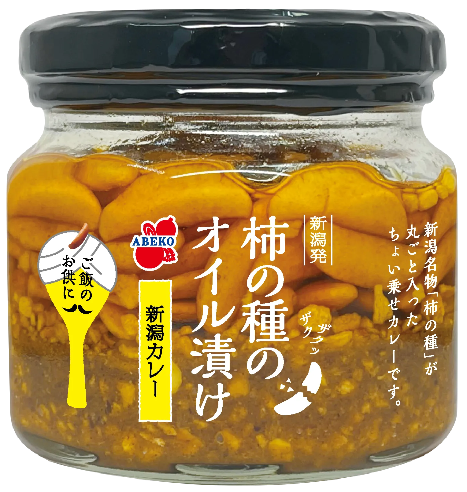 「柿の種のオイル漬け 新潟カレー」は、新潟名物「柿の種」が丸ごと入ったちょい乗せカレーです。幅広い世代にお召し上がりいただけるよう、辛みは中辛程度で、スパイスの中にもだしをきかせた深い味わいに仕上げました。カレーの具には欠かせないじゃがいものフレークを使用し、コクをプラスしています。柿の種、フライドガーリック、フライドオニオンもたっぷり入ってザクザク食感による驚きと楽しさも味わえる商品です。温めなくても美味しく、スプーン1杯から好きな量を好きな時に食べられる手軽さを持ち合わせた、これまでのカレーのイメージを変える革命的なカレーです。温かいご飯はもちろん、さまざまな食材とも相性がよく、これからの季節は温かいうどんやじゃがバターなどのトッピングにもお勧めです。