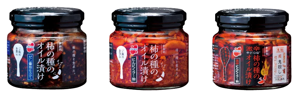 新潟名物「柿の種」を旨味たっぷりのオイルに漬け込んだ新潟土産です。2018年のシリーズ第一弾「柿の種のオイル漬け にんにくラー油」を発売以来、調味液に浸かりながらもザクザクな柿の種の食感がご好評をいただいています。現在は、かつおだしをきかせた「柿の種のオイル漬け だし醤油仕立て」、超激辛の唐辛子粉末を使用した「柿の種のオイル漬け 激辛にんにくラー油」も取り揃えています。