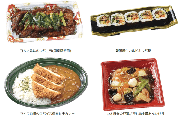 8月にラインアップする商品は、暑い夏を乗り切るのにおすすめな「コクと旨味のレバニラ(国産豚使用)」「韓国風牛カルビキンパ巻」「ライフ自慢のスパイス香る甘辛カレー」「1/3日分の野菜が摂れる中華あんかけ丼」の4品です。