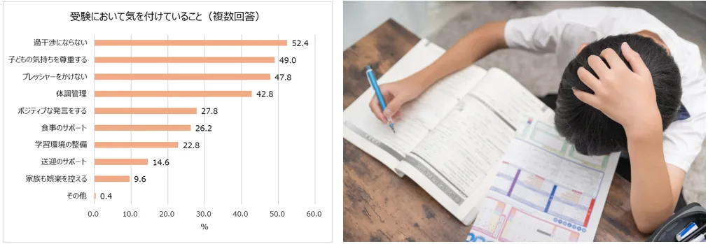 受験において気を付けていること1位は、過半数が回答した「過干渉にならない(52.4%)」でした。次いで「子どもの気持ちを尊重する(49.0%)」「プレッシャーをかけない(47.8%)」という回答が多く、精神面や、子どもとの距離の取り方に気を遣っている親が特に多いことがわかります。