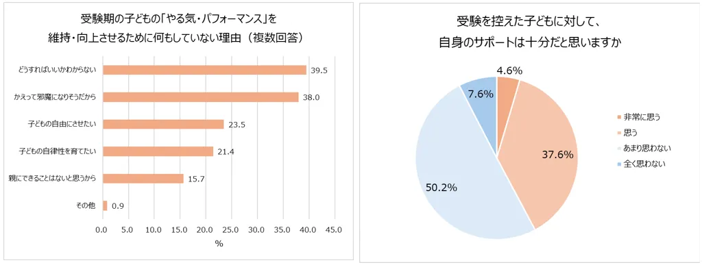 何もしていない理由の1位は「どうすればいいかわからない(39.5%)」でした。サポートを強化したい気持ちはあるものの、何をすれば子どものためになるのか悩んでいる親も多そうです。子どもに対する自身のサポートについて、十分だとは思わないと回答した親が多数派でした。
