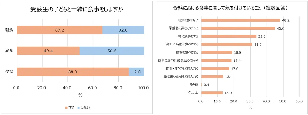 受験を控えた子どもとのコミュニケーションや、自身のサポートに不安を感じている親がいることがわかりました。親子のコミュニケーションのきっかけにもなるのが、食事の場。親子で一緒に食事をとっているか聞いたところ、夕食は約9割の親子が一緒にとっていました。朝食も約7割の親子が一緒にとっており、コミュニケーションへの悩みは抱えながらも、可能な限り子どもと一緒に食事をしようとしている親が多いようです。食事に関して気を付けていることを聞いたところ、「朝食を抜かない(48.2%)」「栄養価の高さ・バランス(45.0%)」といった意見がありました。