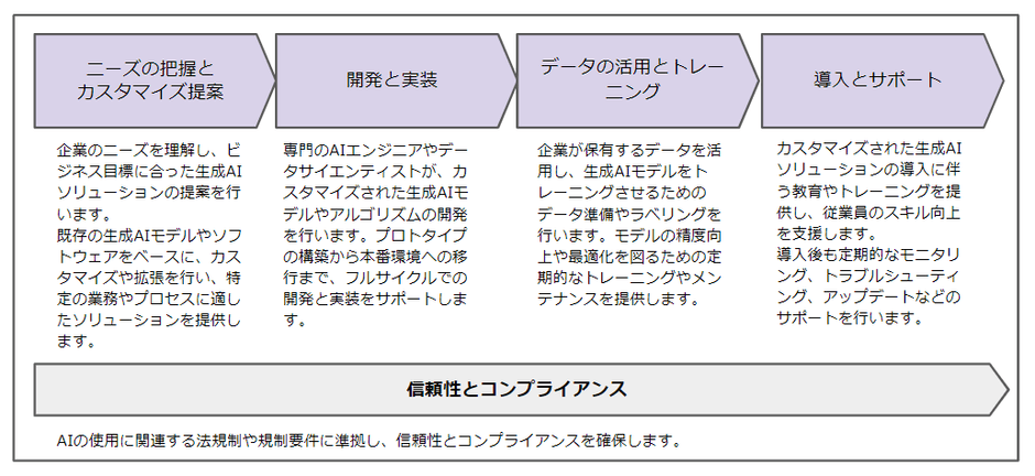 信頼性生成AIサービス導入フローにおいても信頼性とコンプライアンス遵守の確保を十分に考慮します。