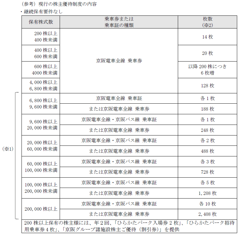 保有株式数に応じて、京阪電車の座席指定特別車両「プレミアムカー」乗車のためのプレミアム