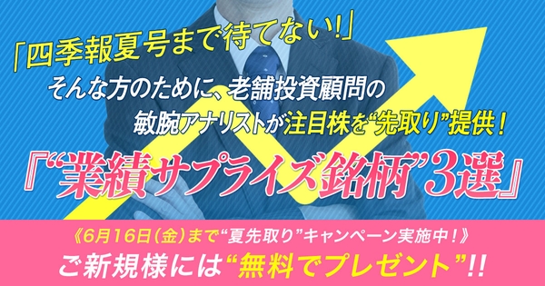 さらに《”夏先取り”キャンペーン》として、16日(金)までにキャンペーンページよりご登録されたご新規様には「1万円分の閲覧ポイント」をプレゼント中。実質無料で『“業績サプライズ銘柄”3選』をご覧になれます。