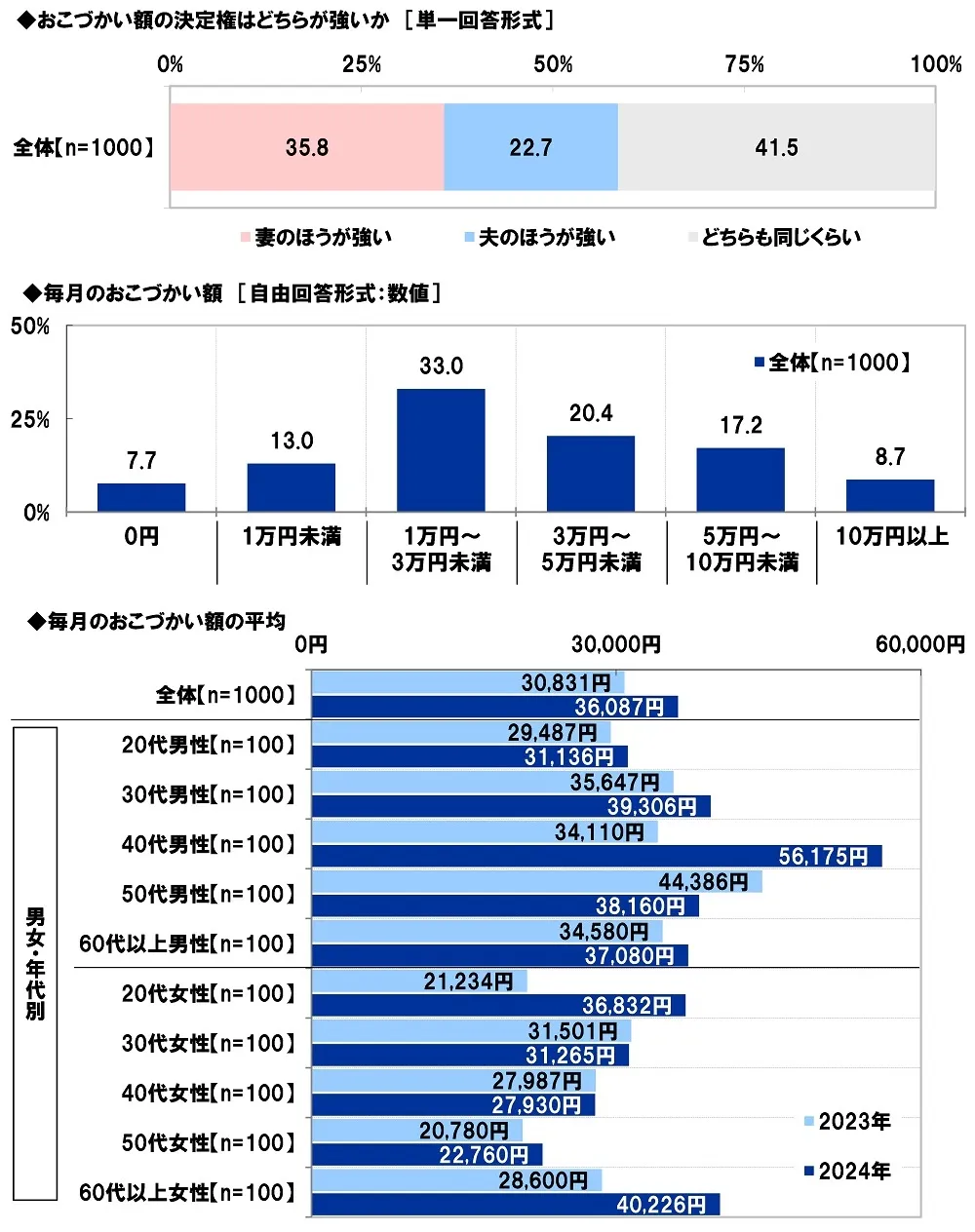 全回答者(1,000名)に、おこづかい額の決定権はどちらが強いか聞いたところ、「妻のほうが強い」は35.8%、「夫のほうが強い」は22.7%、「どちらも同じくらい」は41.5%となりました。