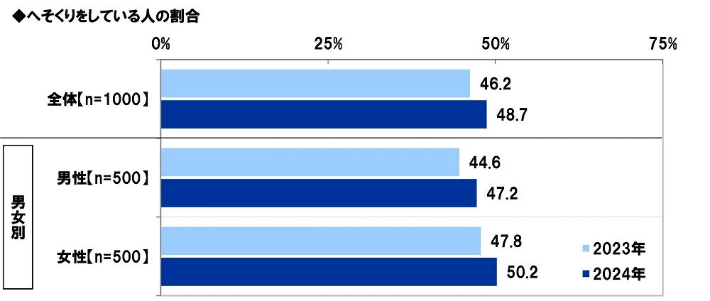 昨年の調査結果と比較すると、へそくりをしている人の割合は、2023年46.2%→2024年48.7%と2.5ポイント上昇しました。