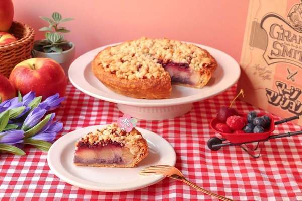 マージマンションゲーム内に登場するアイテム「ホープベリー」をイメージした自家製ベリージャムに、ベリー仕立てのアーモンドクリームとたっぷりのりんご、アーモンドクランブルを乗せて焼き上げた特別なコラボアップルパイ。グラニースミス得意のクランブルアップルパイでオリジナルのベリーアップルパイに仕上げました。