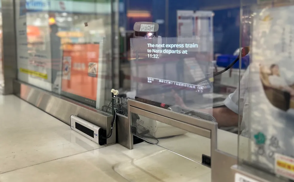 特急券発売窓口に貼付したスクリーンに、お客さまと駅係員の会話をシステムが自動翻訳し、リアルタイムに双方が使用している言語内容を表示することでスムーズな対応が可能になります。