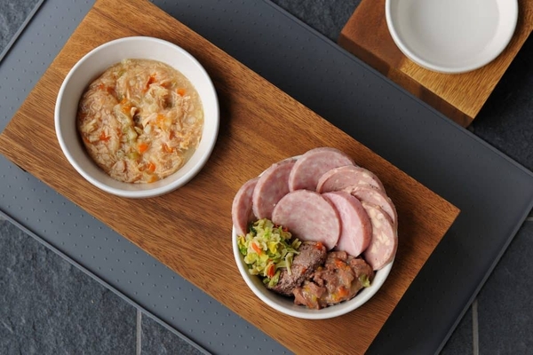内容:猪と野菜のミンチ、鯛と野菜のミンチ、5種の野菜と鶏肉のスープ、水