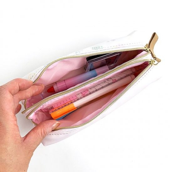 Wファスナーで仕切られているので、中身を整理して収納することができちゃいます。かわいいカラーペンやボールペンなど、ついつい買ってしまう♪という人にはもってこいのペンポーチですね。