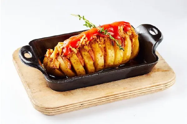 商品例:丸ごとポテトとスモークソーセージのカリーブルスト “ハッセルバック”