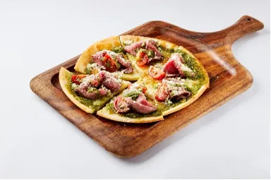 商品例:自家製ローストビーフと農家さんのバジルのクリスピーピザ
