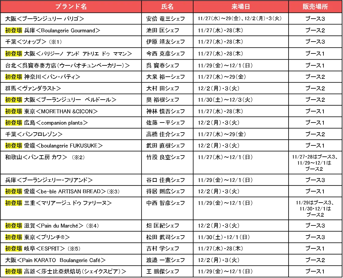 会場内の3つの製造ブースには、大阪で大人気の<ブーランジュリー パリゴ>の安倍竜三シェフを筆頭に、全国各地そして台湾から7日間で計21名のシェフ(うち13名が初登場)が来場し、会場でこだわりのパンを焼き上げます。2~3日で来場シェフが入れ替わるため、会期中何度来場しても新鮮なラインナップをお楽しみいただけます。
