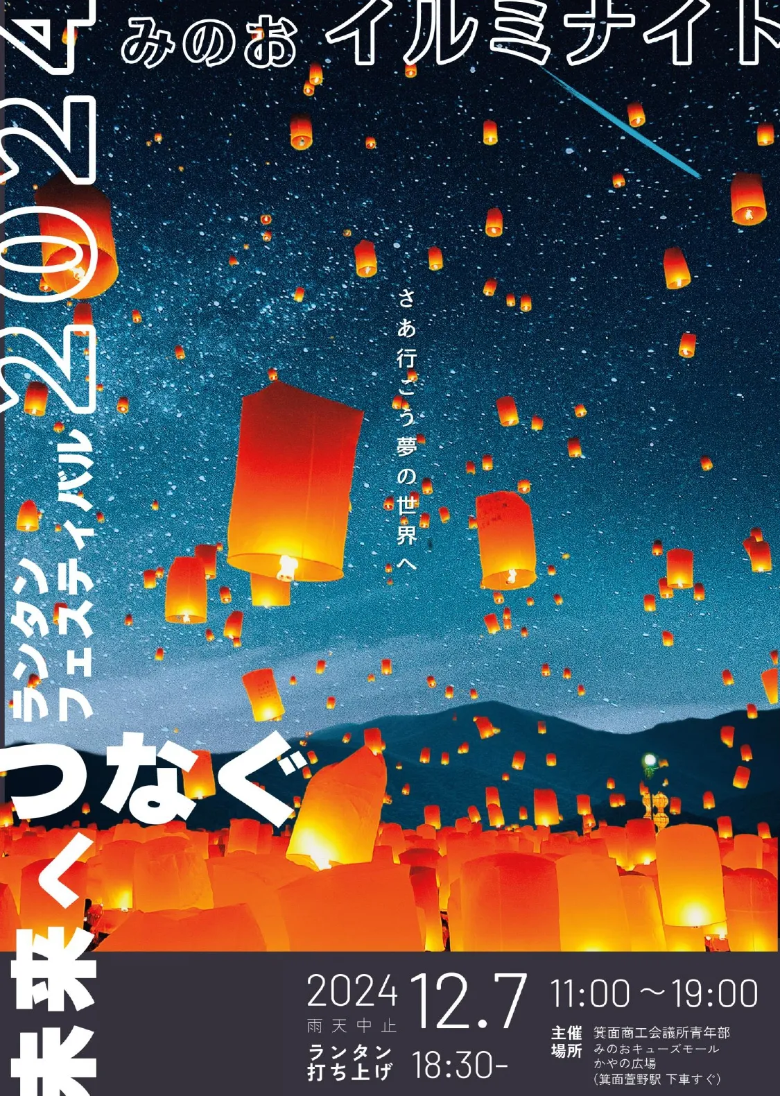 内 容:イルミネーション初日の12月7日(土)には、「みのおイルミナイト2024」の点灯式として約200個のランタンを夜空に放つ「ランタン打ち上げ」を実施します。そのほか学生たちによる「箕面ダンスコンテスト」のほか、キッチンカーや模擬店の出店で、みのおキューズモールのクリスマスを盛上げます。
