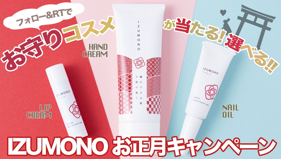 当社は、1月1日から、公式Twitterで「お守りコスメが当たる! 選べる! お正月キャンペーン」を開催します。ご参加いただいた方の中から抽選で、縁結びの国・出雲だけに咲くバラのエキスを配合した恋叶えるコスメ『IZUMONO』のお好きなアイテム1点をプレゼントします。