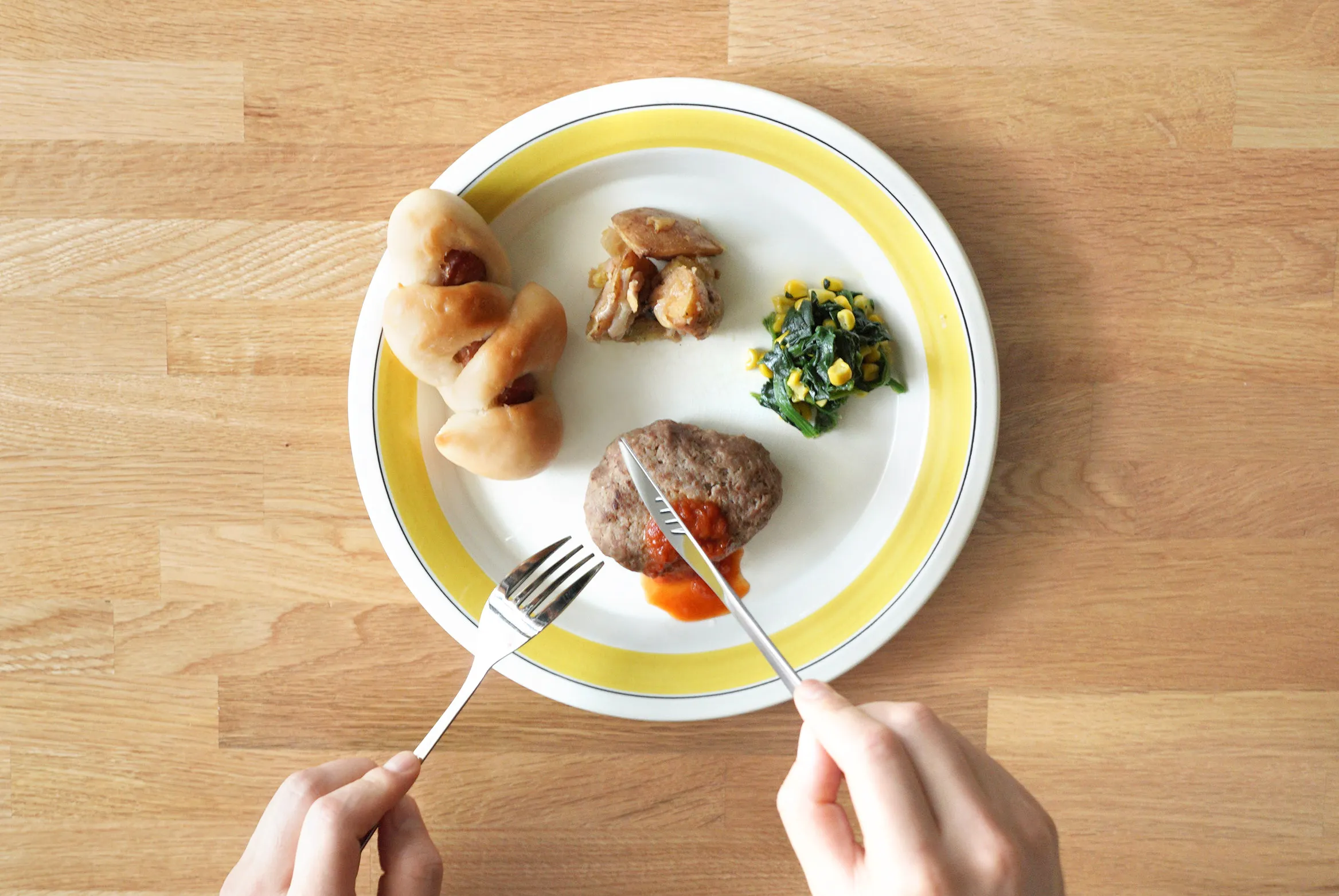 【内容】ウインナーパン、ハンバーグ トマトソース、ジャーマンポテト、ほうれん草 とコーンのソテー